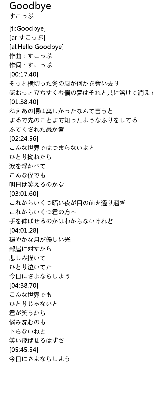 | [01:19.25] | ぼおっと立ちすくむ僕の夢はそれと共に溶けて消えて |