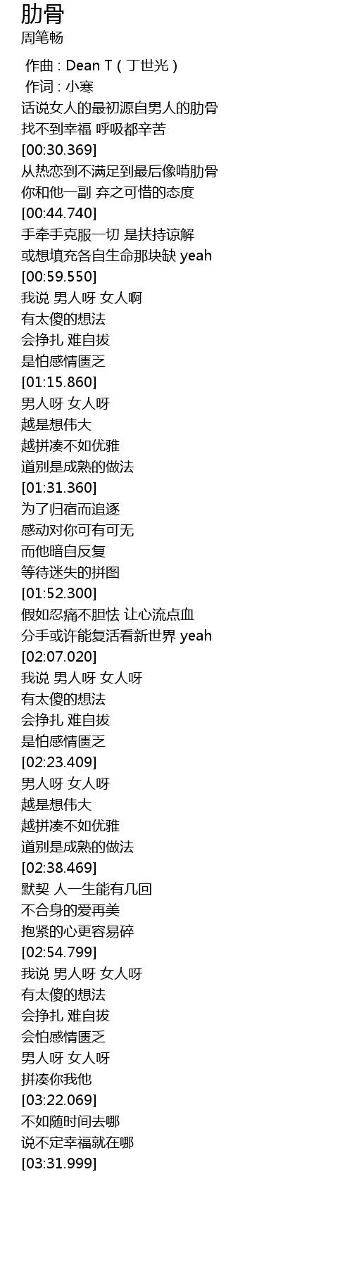 | [00:31.880] | 从热恋到不满足到最后像啃肋骨 |