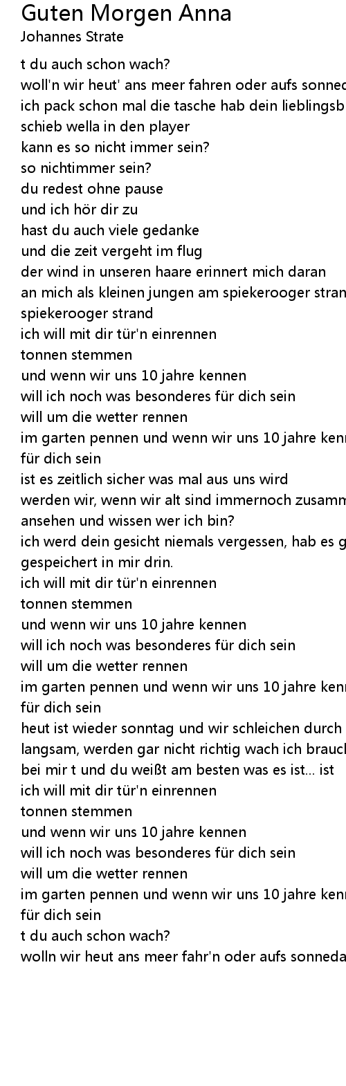 | heut ist wieder sonntag und wir schleichen durch den tag wir machen alles langsam, werden gar nicht richtig wach ich brauch nicht viel zum leben wenn du bei mir t und du weißt am besten was es ist... ist | |