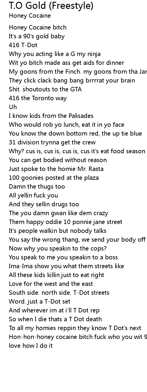 [01:50.69] Hon-hon-honey cocaine bitch fuck who you wit 90's gold thang and they love how I do it