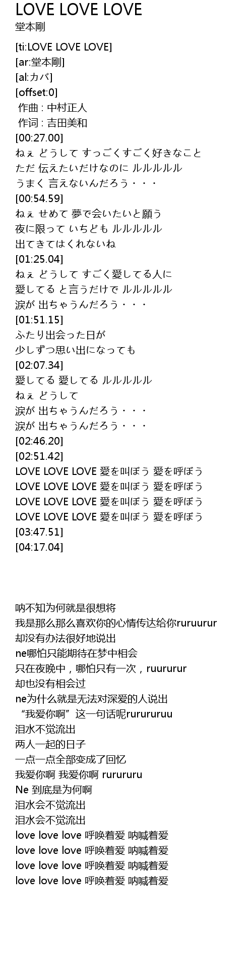 | [02:53.99] | LOVE LOVE LOVE 愛を叫ぼう 愛を呼ぼう |