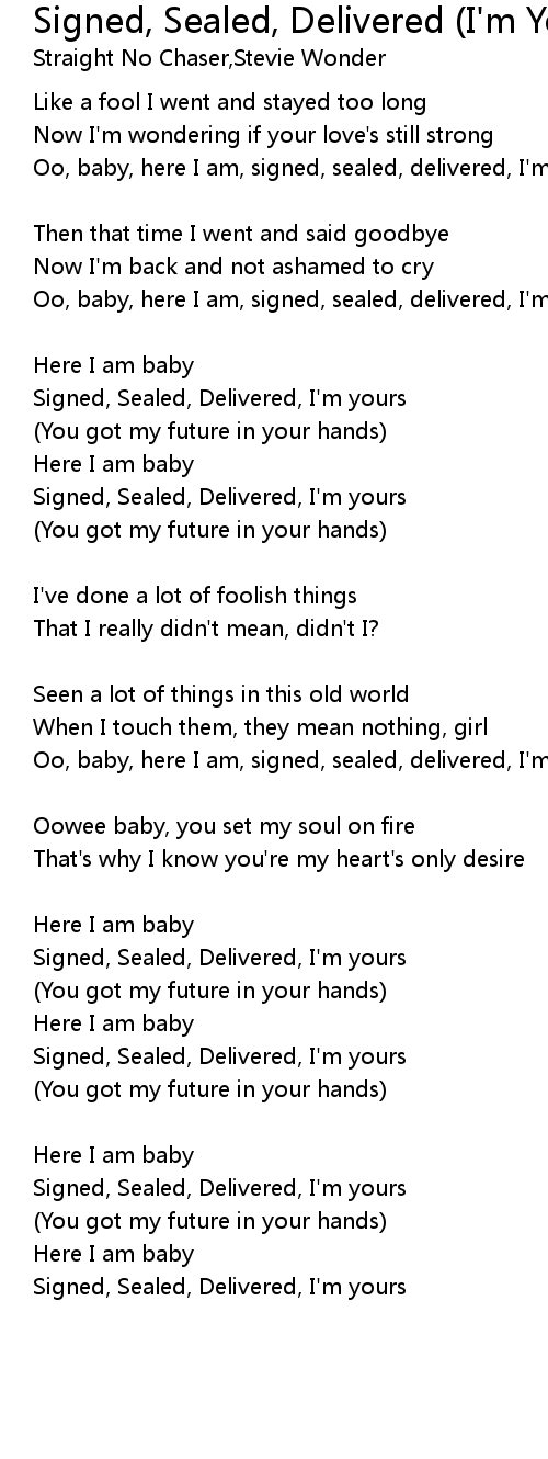Oo, baby, here I am, signed, sealed, delivered, I'm yours! |