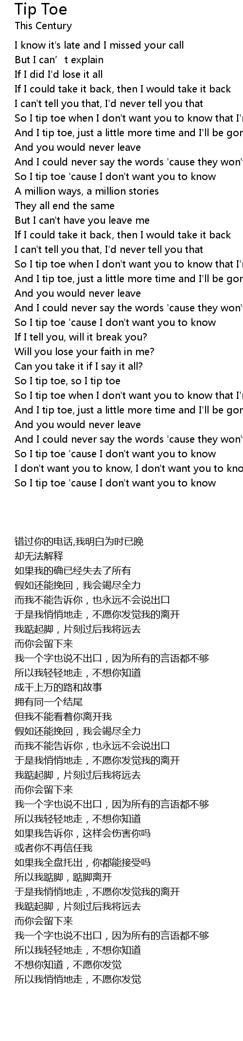 | [00:35.340] | So I tip toe when I don' t want you to know that I' m not around |