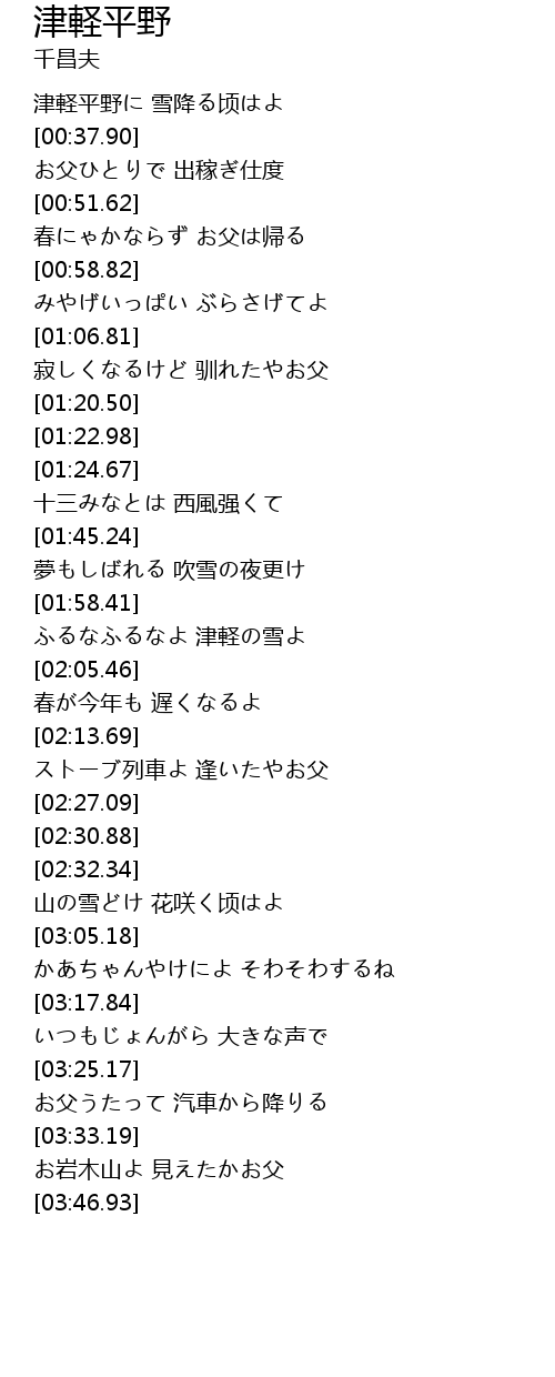 | [00:26.28] | 津軽平野に 雪降る顷はよ |