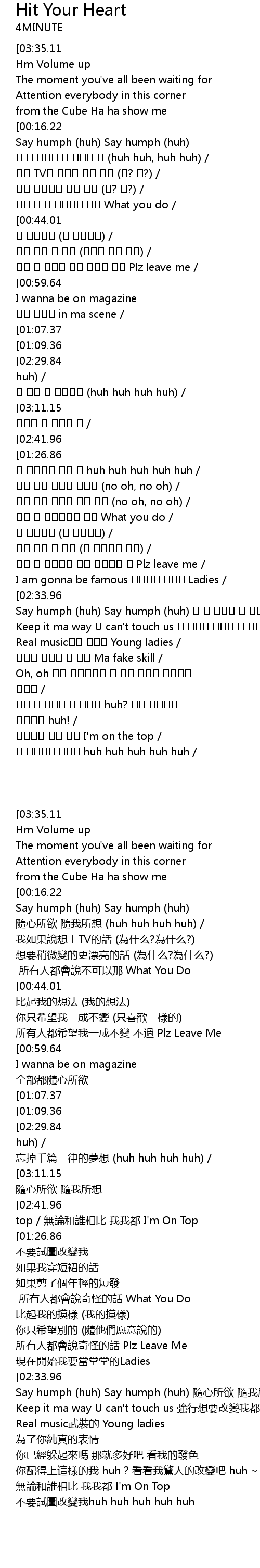 | [03:26.96][03:11.15][01:34.77][01:19.02] | Say humph (huh) Say humph (huh) 난 내 맘대로 내 멋대로 해 / |