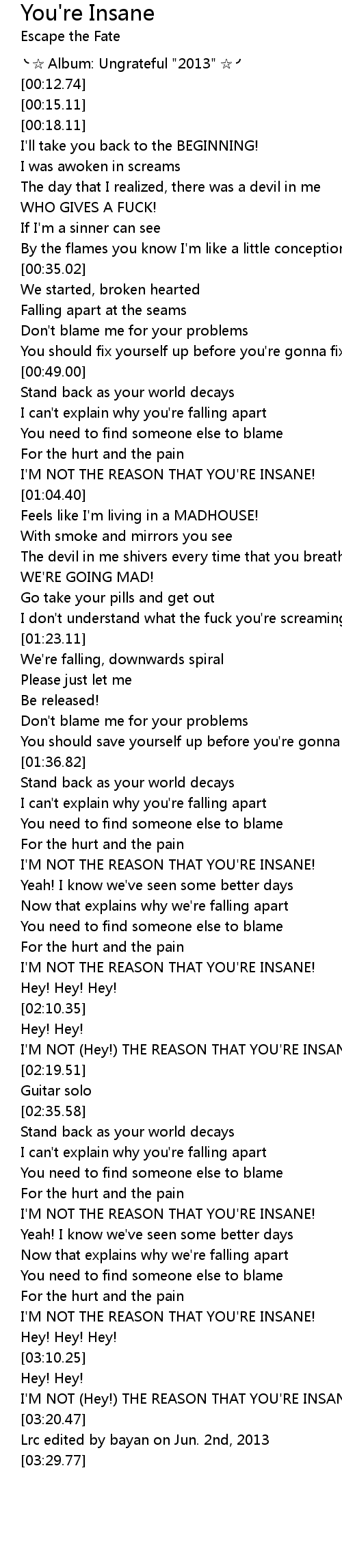 | [03:15.99] | I' M NOT Hey! THE REASON THAT YOU' RE INSANE! |