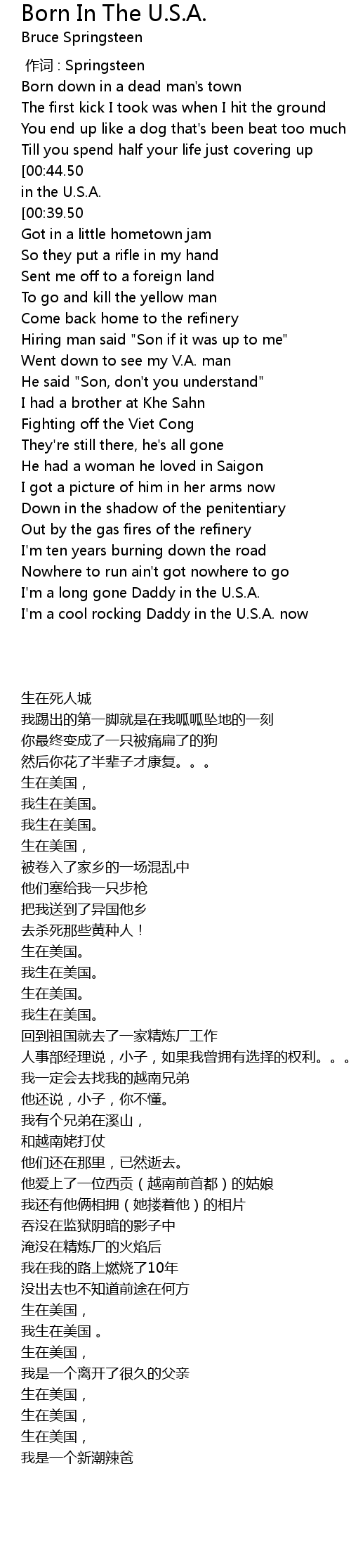 | [00:35.50][00:39.50][01:07.50][01:15.50][02:41.50] | I was born in the U.S.A. |