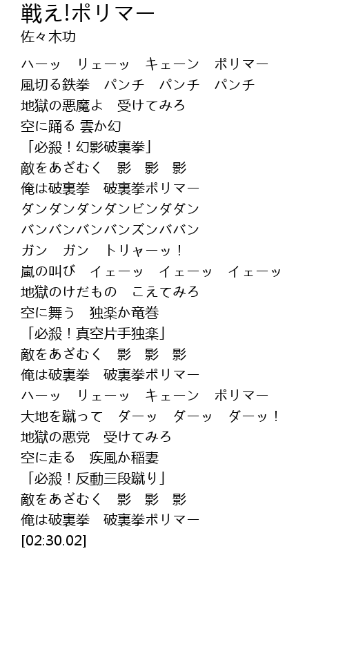 | [00:10.21] | 風切る鉄拳 パンチ パンチ パンチ |