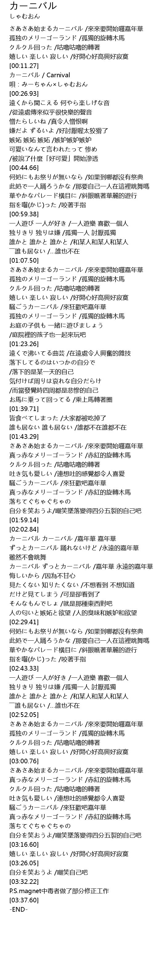 | [02:17.79] | カーニバル ずっとカーニバル /嘉年華 永遠的嘉年華 |