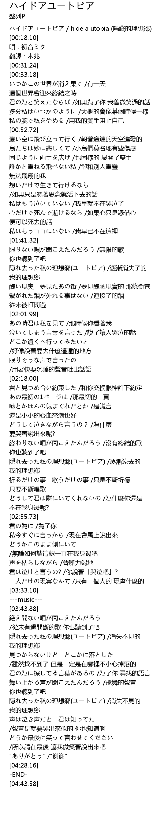 | [00:01.18] | ハイドアユートピア / hide a utopia (隱藏的理想郷) |
