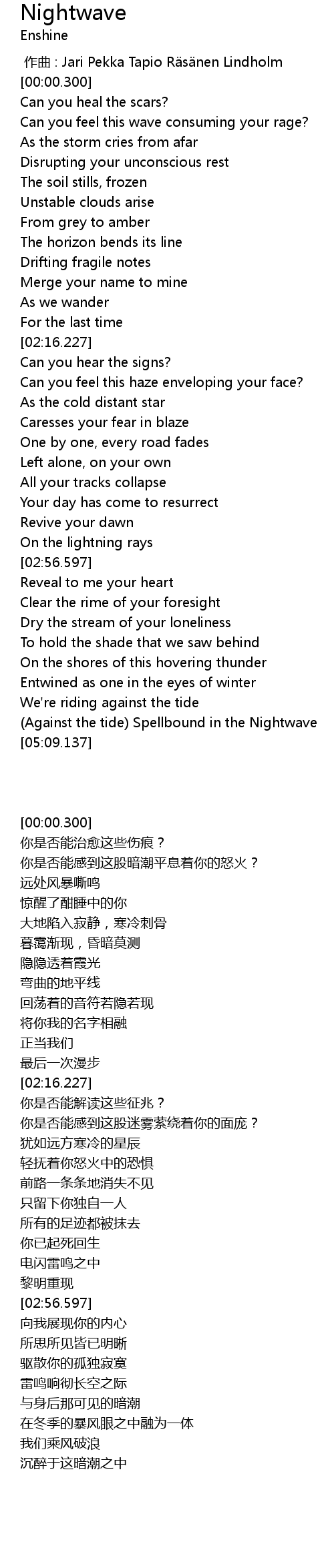 | [04:59.137] | Against the tide Spellbound in the Nightwave |