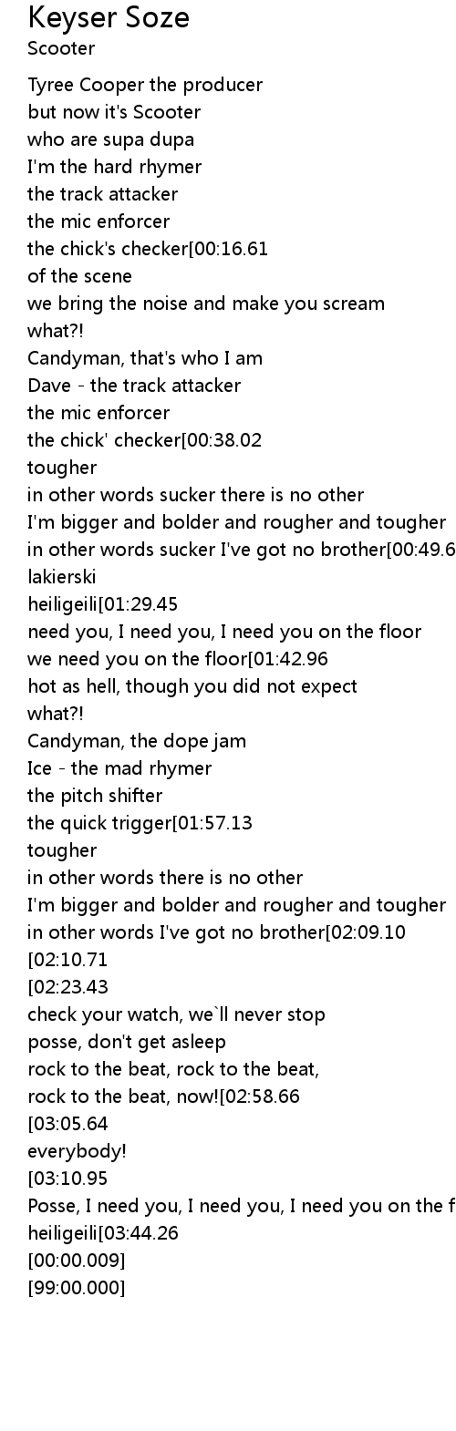 [00:46.38]in other words sucker I've got no brother[00:49.60]bring the break[00:52.54]lakierski materialski[00:58.90]heiligeili[01:29.45][01:15.71][01:08.88][01:01.94] Posse, I need you, I need you, I need you on the floor