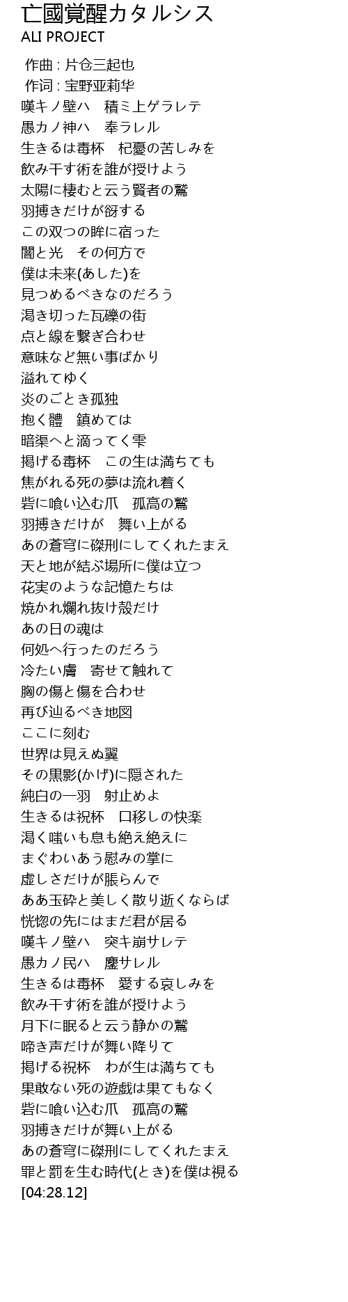 | [03:19.63] | 生きるは毒杯 愛する哀しみを |