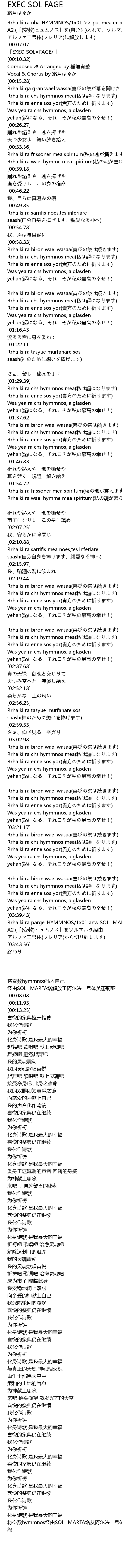 | [00:00.92] | Rrha ki ra nha_HYMMNOS/1x01 >> pat mea en xest SOL=MARTA > A2.(「(変数)ヒュムノス」を(自分に)入れて、ソルマルタ経由 アルファ二号体(フレリア)に解放します) |