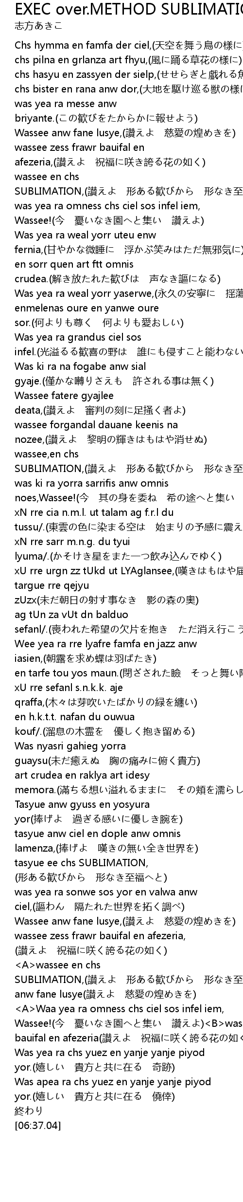 | [05:37.28] | <A>wassee en chs SUBLIMATION,(讃えよ 形ある歓びから 形なき至福へと)<B>Wassee anw fane lusye(讃えよ 慈愛の煌めきを) |