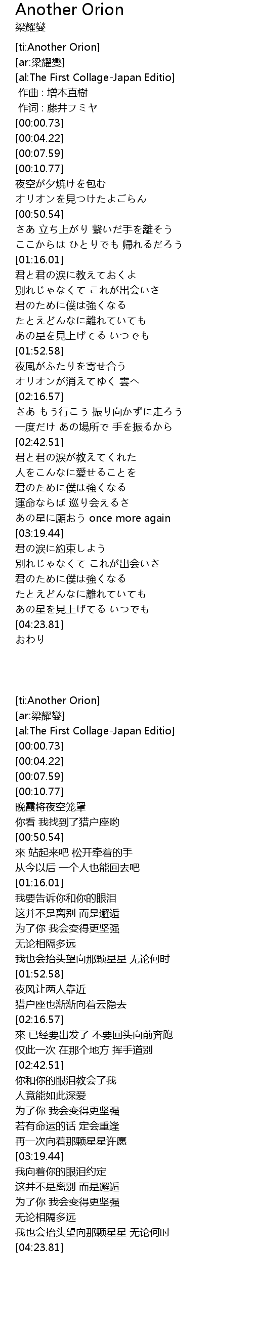| [02:06.46] | オリオンが消えてゆく 雲へ |