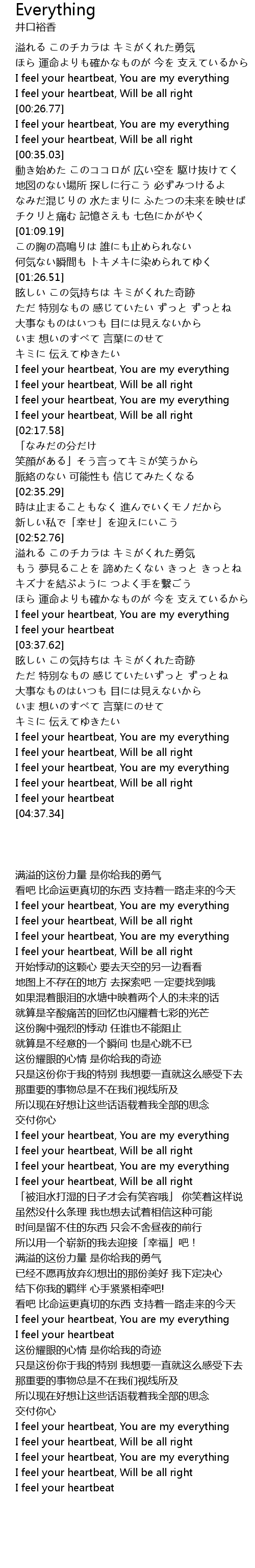 | [03:27.58] | I feel your heartbeat, You are my everything |