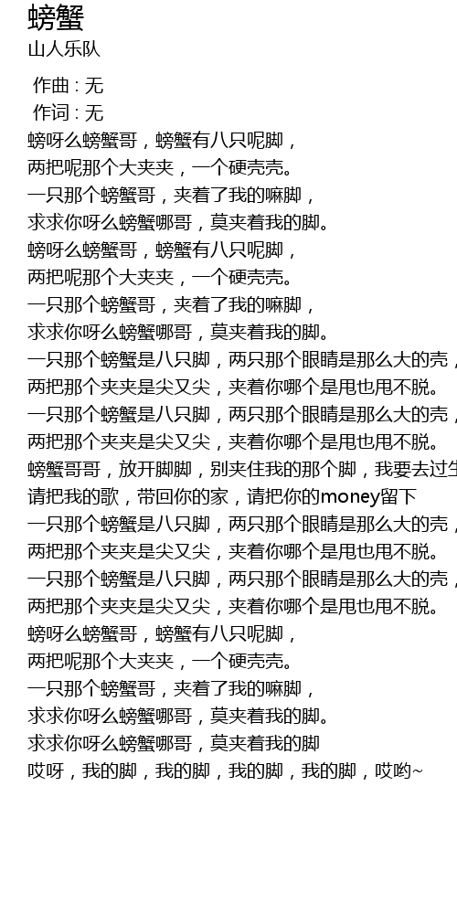 | [00:55.43] | 求求你呀么螃蟹哪哥,莫夹着我的脚。 |