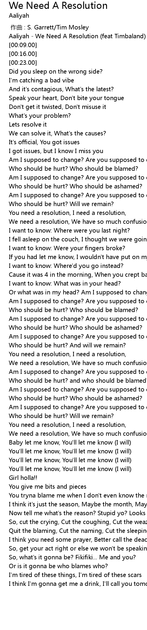 | [00:02.00] | Aaliyah - We Need A Resolution (feat Timbaland) |