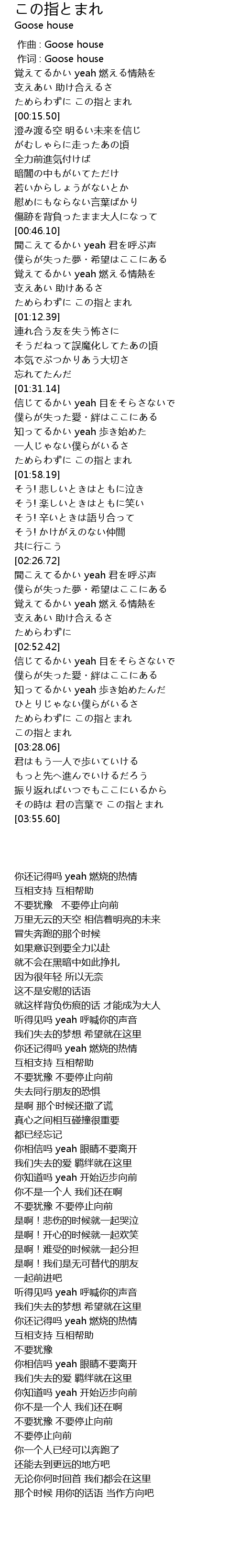 | [03:39.69] | その時は 君の言葉で この指とまれ |
