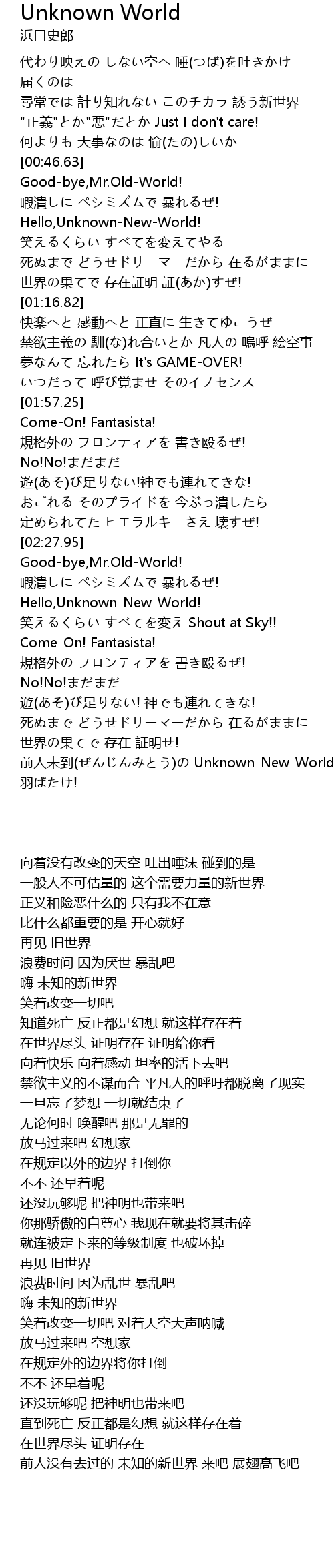 | [03:44.34] | 前人未到(ぜんじんみとう)の Unknown-New-World さあ 羽ばたけ! |