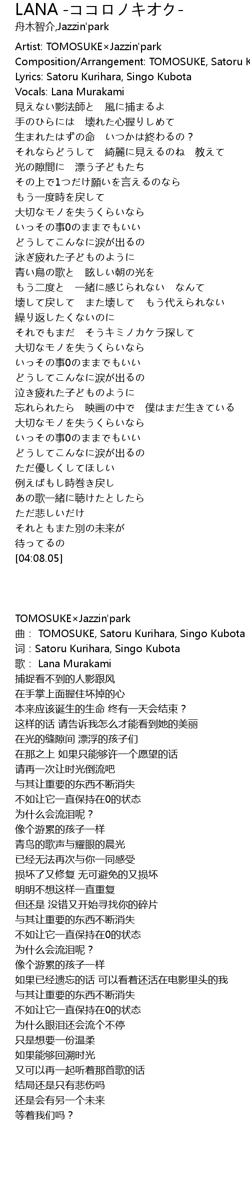 | [00:02.41] | Composition/Arrangement: TOMOSUKE, Satoru Kurihara, Singo Kubota |