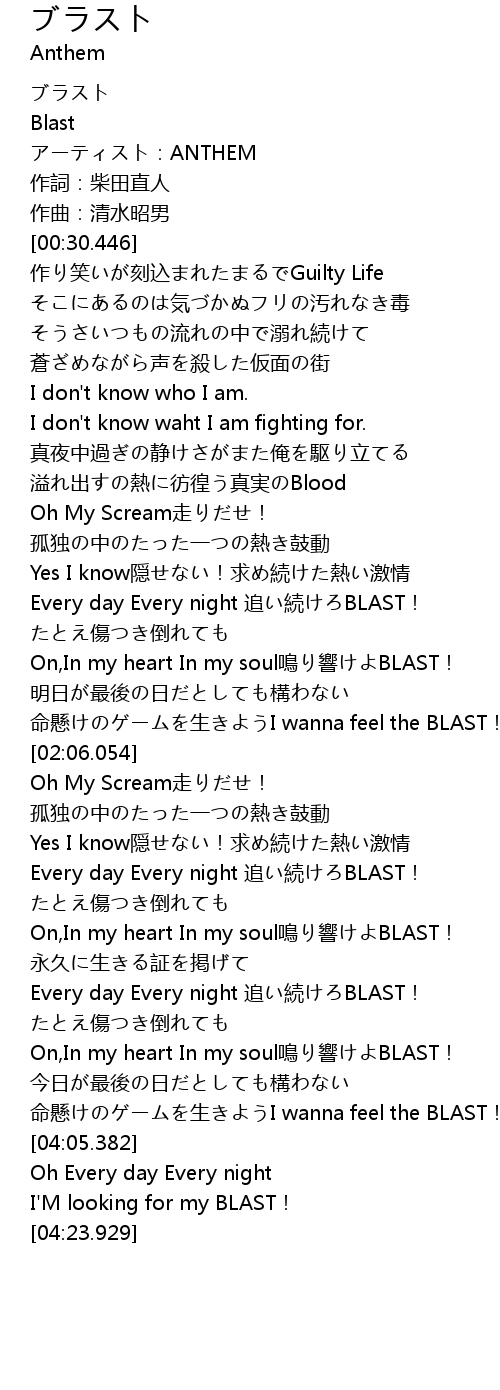 | [03:30.587] | Every day Every night 追い続けろBLAST! |