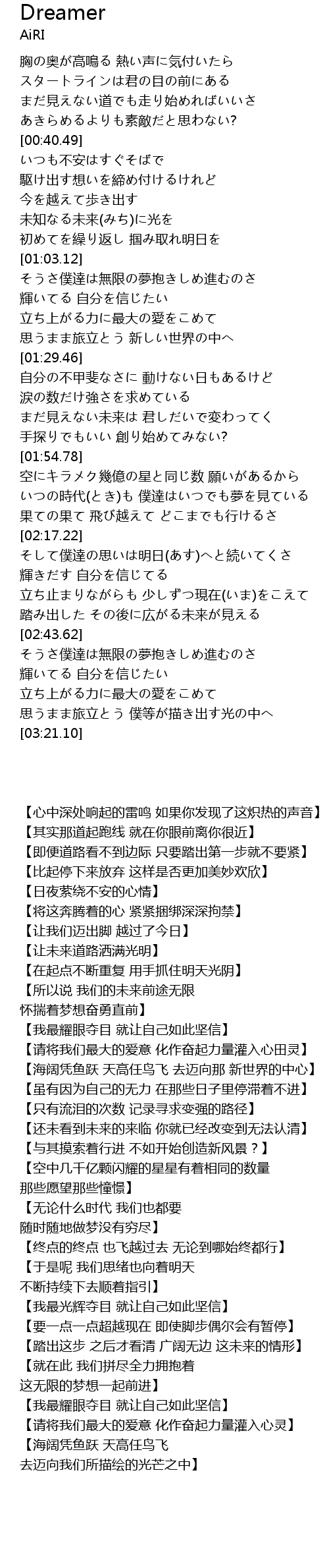 | [01:03.33] | そうさ僕達は無限の夢抱きしめ進むのさ |