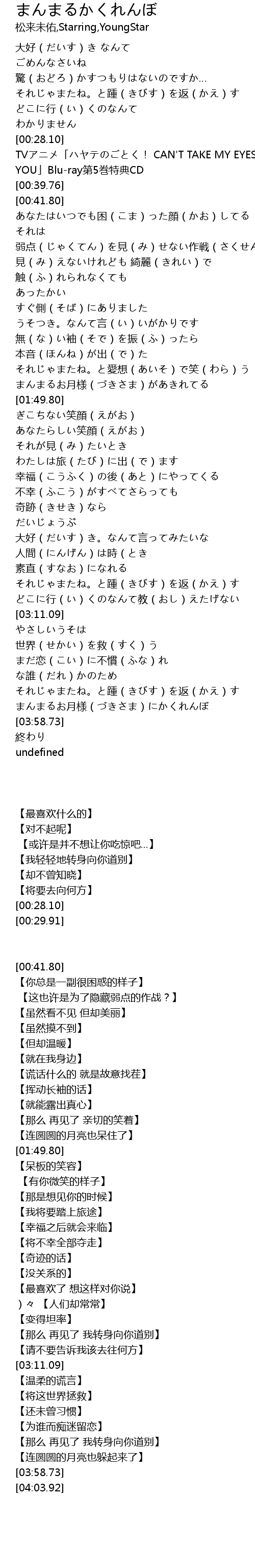 | [03:50.99] | まんまるお月様(づきさま)にかくれんぼ |
