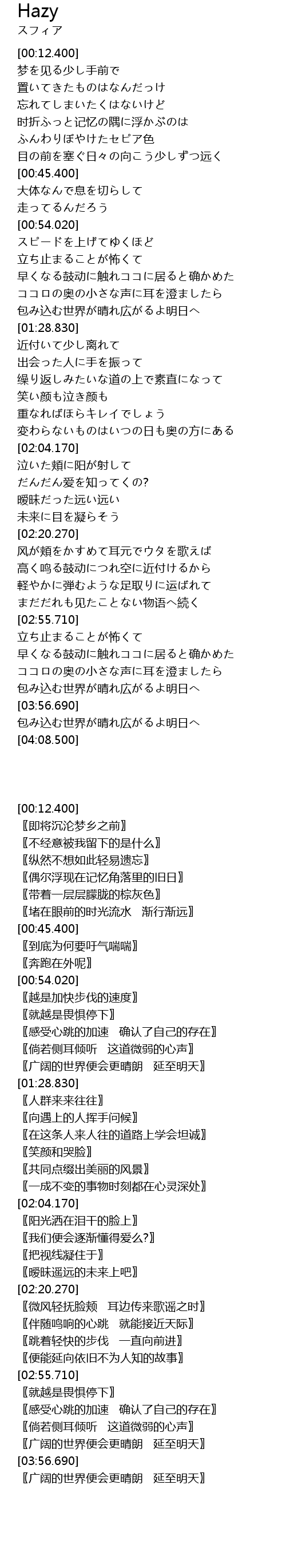| [03:58.660] | 包み込む世界が晴れ広がるよ明日へ |