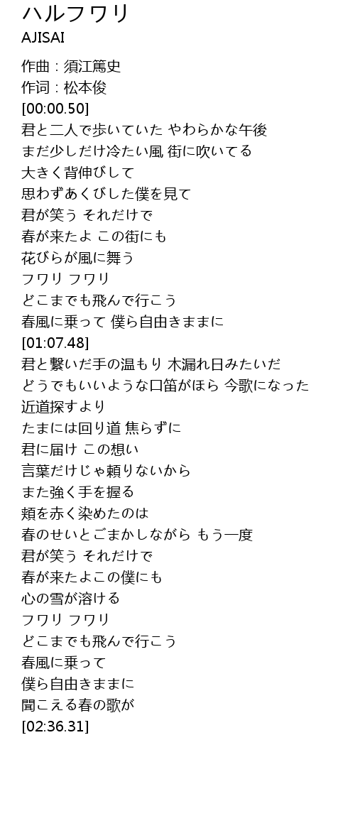 | [01:00.14] | 春風に乗って 僕ら自由きままに |