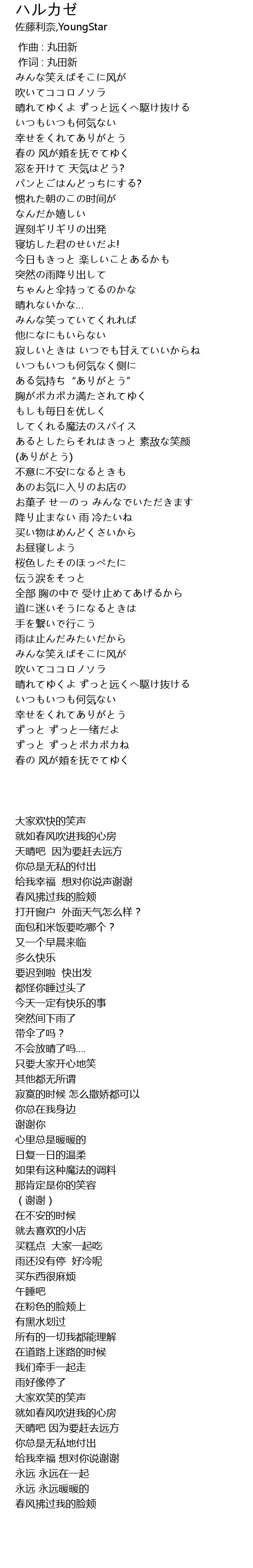 | [00:21.100] | 春の 风が頬を抚でてゆく |