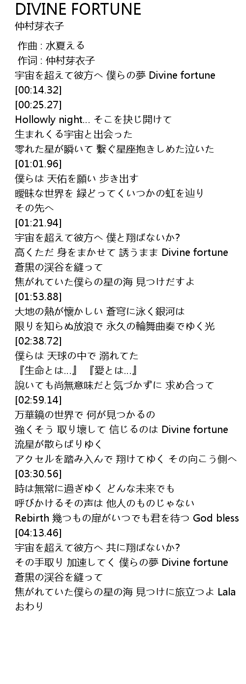 | [00:01.90] | 宇宙を超えて彼方へ 僕らの夢 Divine fortune |