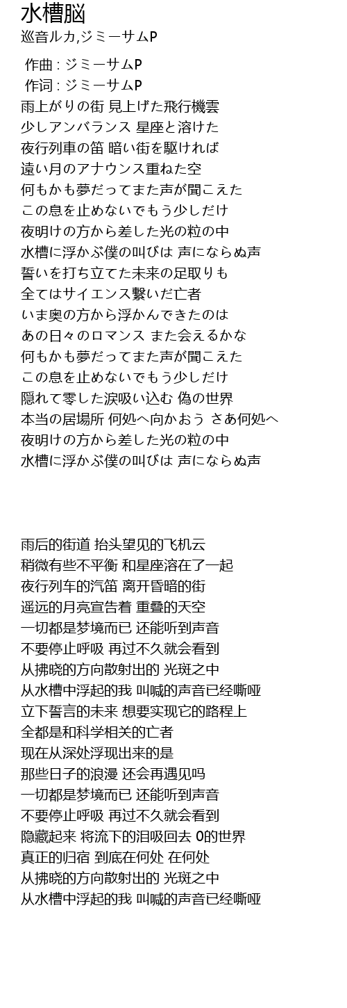 | [03:32.60] | 水槽に浮かぶ僕の叫びは 声にならぬ声 |