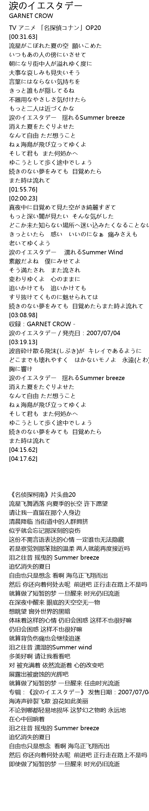 | [03:10.98] | 収録:GARNET CROW - 涙のイエスタデー/発売日:2007/07/04 |