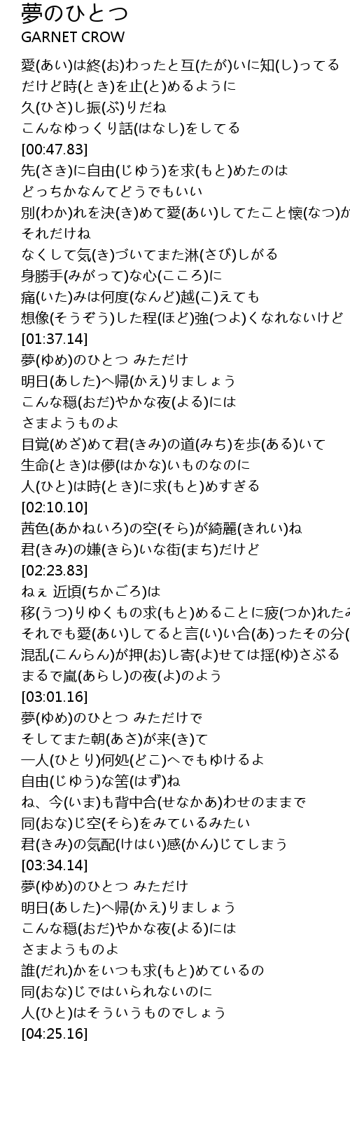 | [01:39.00] | 夢(ゆめ)のひとつ みただけ |