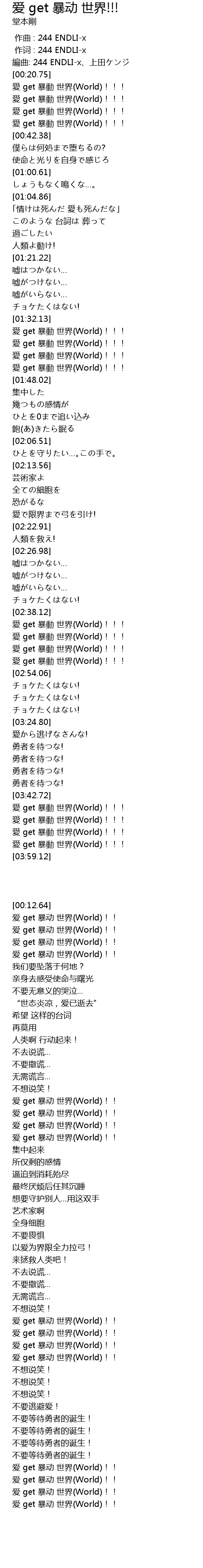 | [02:38.35] | 愛 get 暴動 世界(World)!!! |