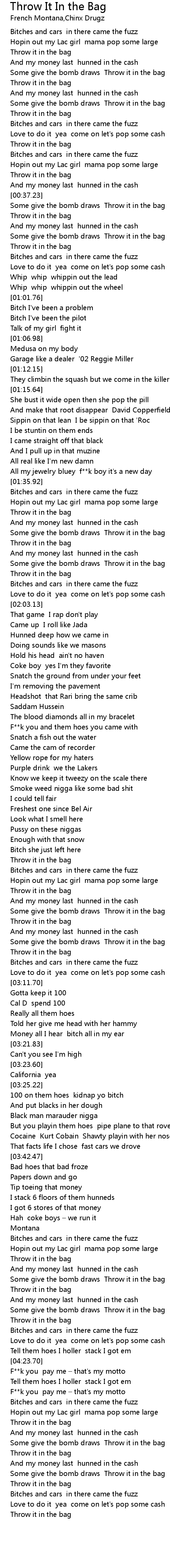 | [00:37.89] | Some give the bomb draws Throw it in the bag |