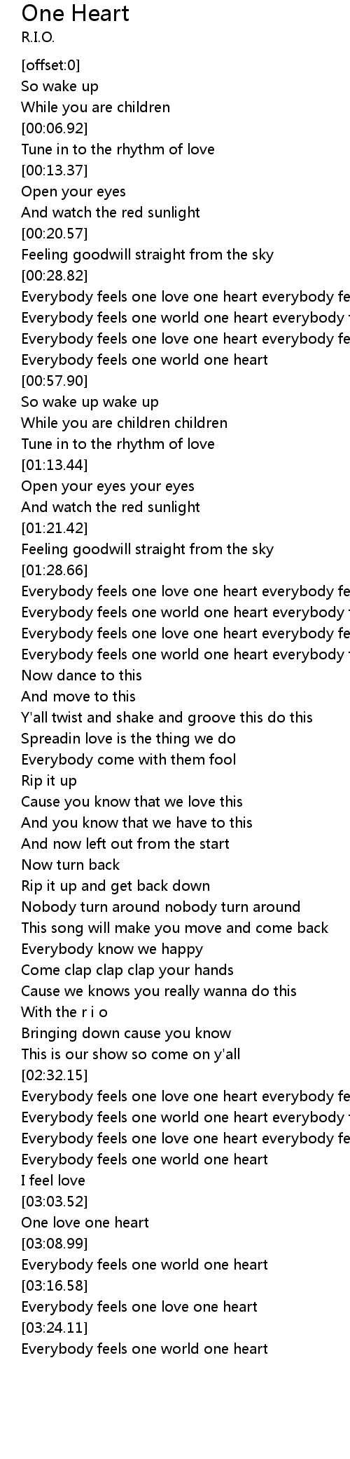 Everybody feels one love one heart everybody feel it |