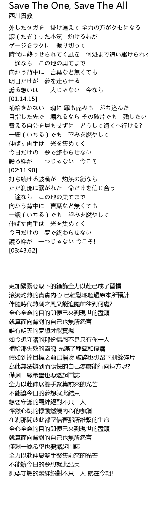 | [03:32.90] | 護る絆が 一つじゃない 今こそ! |