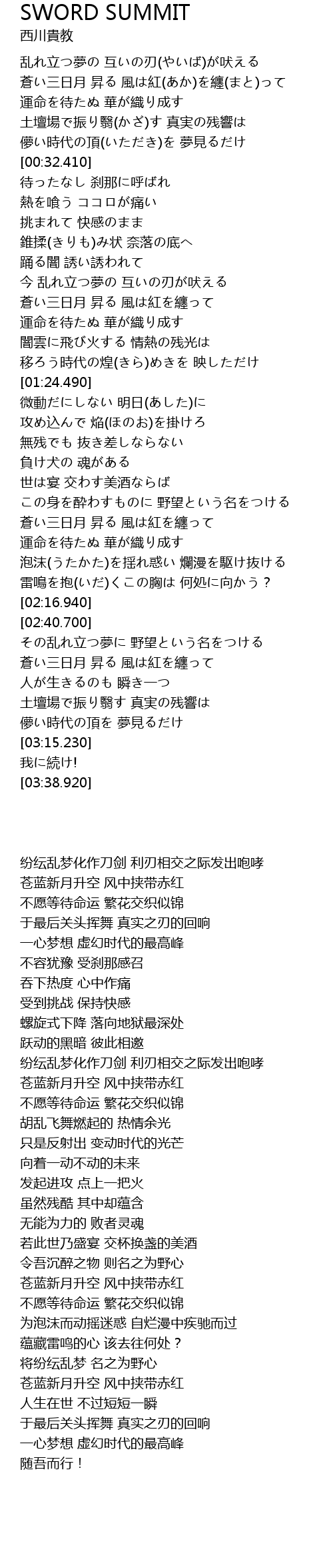 | [01:32.490] | 攻め込んで 焔(ほのお)を掛けろ |