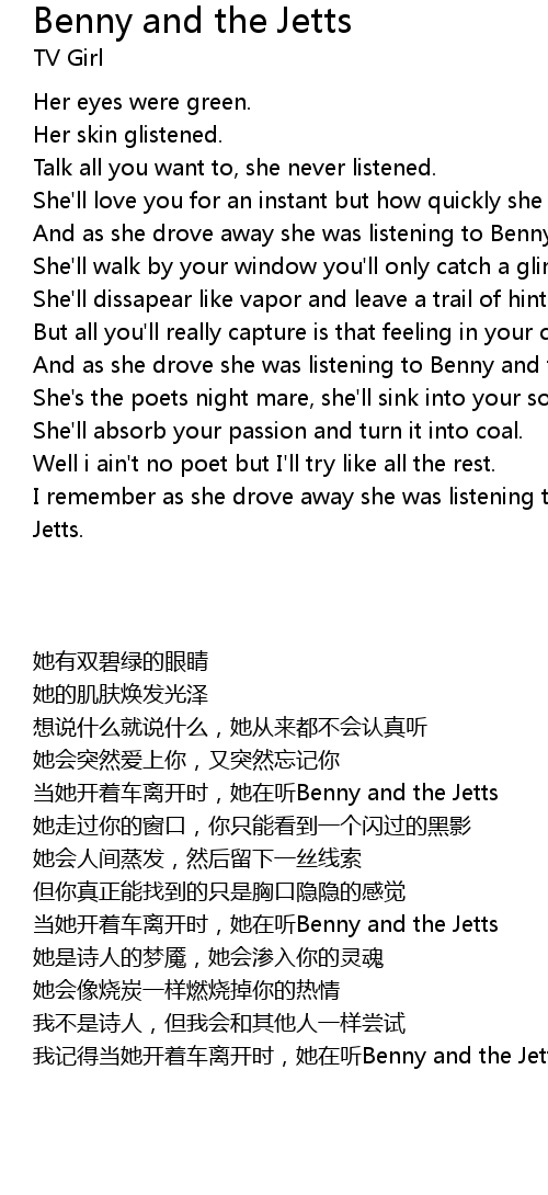 [00:47.000] And as she drove away she was listening to Benny and the Jetts.