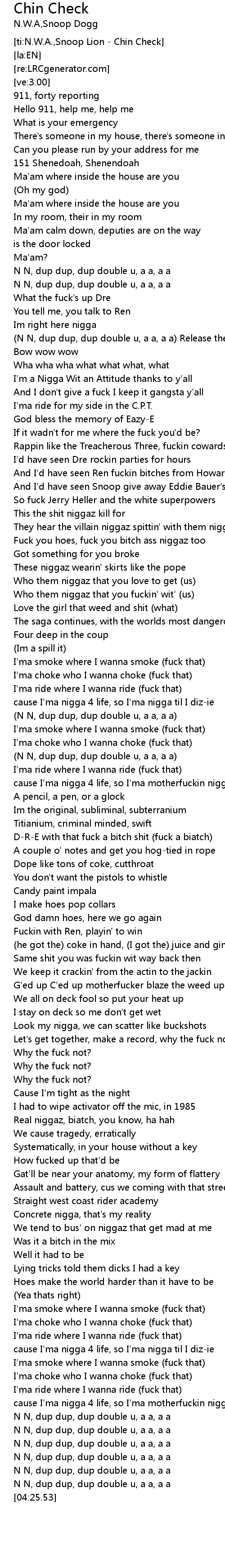 | [ti:N.W.A.,Snoop Lion - Chin Check] | |