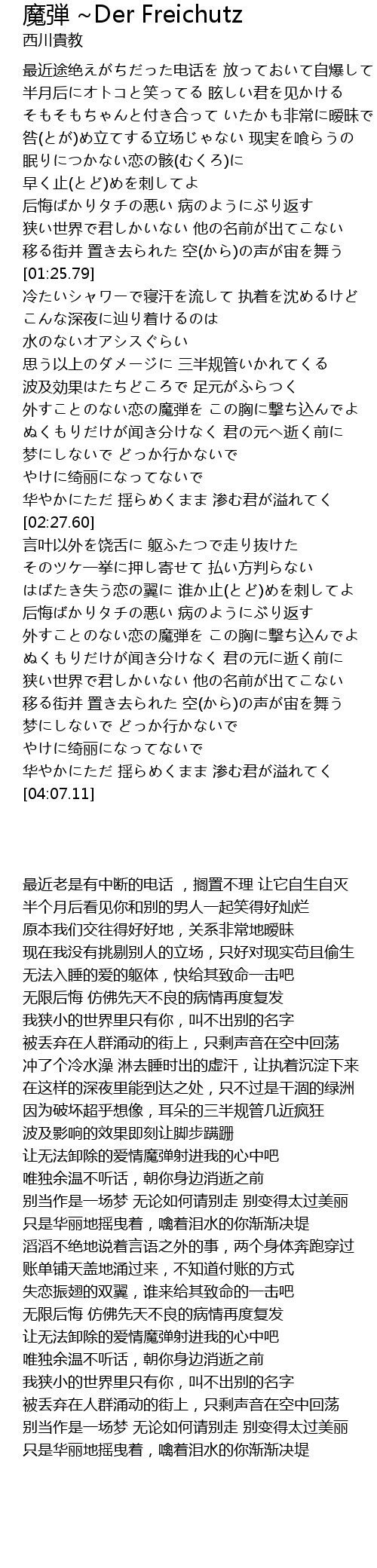 | [03:23.65] | 外すことのない恋の魔弾を この胸に撃ち込んでよ |