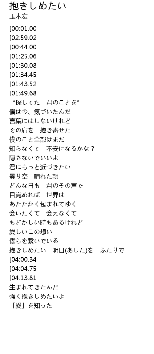 | [00:03.25][01:25.06][03:28.42] | 抱きしめたい 誰よりも 君を |