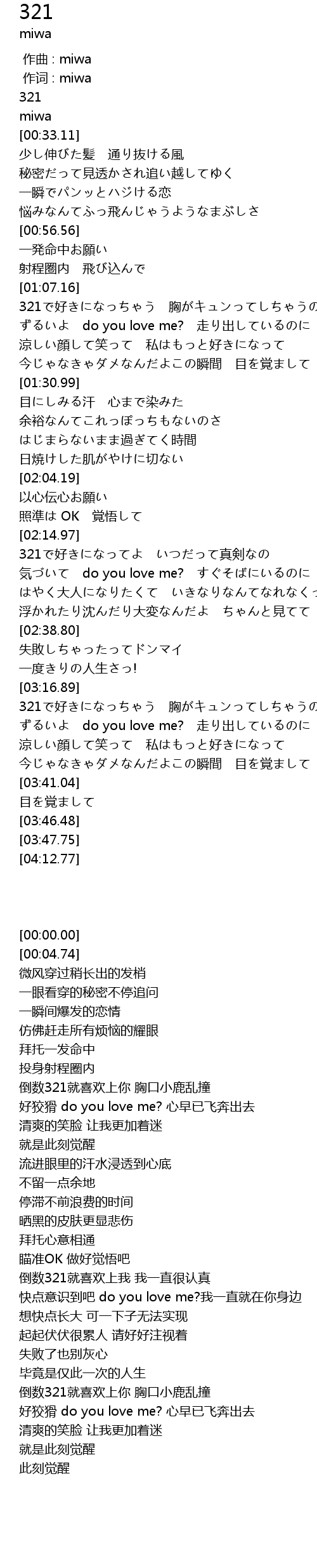 | [03:18.00] | 321で好きになっちゃう 胸がキュンってしちゃうの |