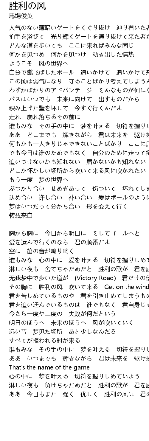 | ああ 今日もまた 强く 优しく 胜利の风は 君の胸に吹いている |