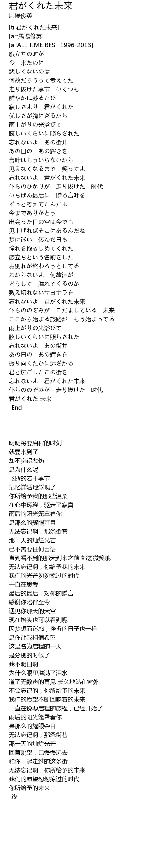 | [01:39.32] | 忘れないよ 君がくれた未来 |