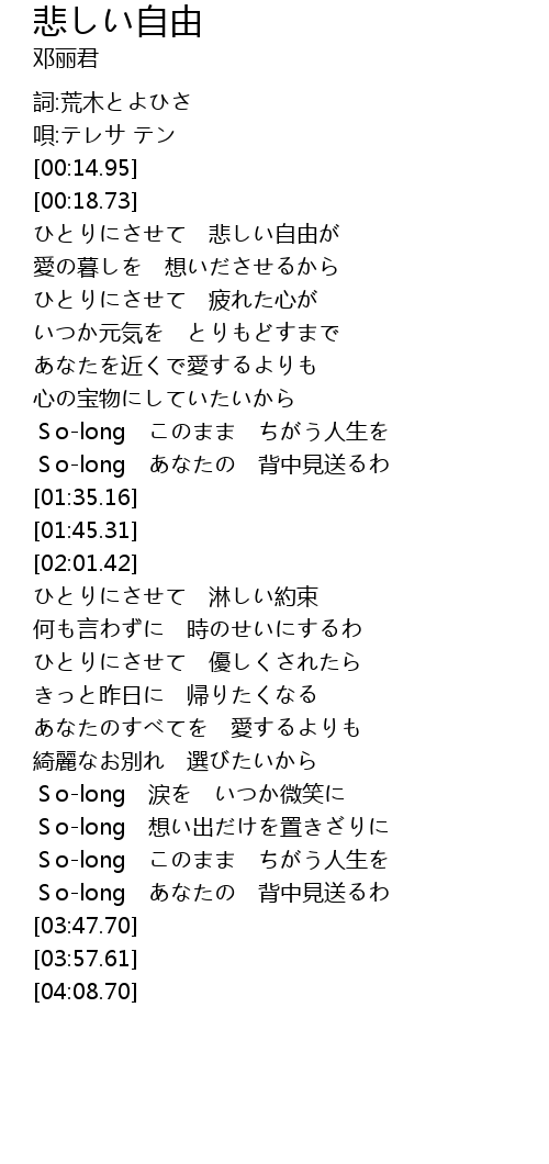 | [00:20.78] | ひとりにさせて 悲しい自由が |