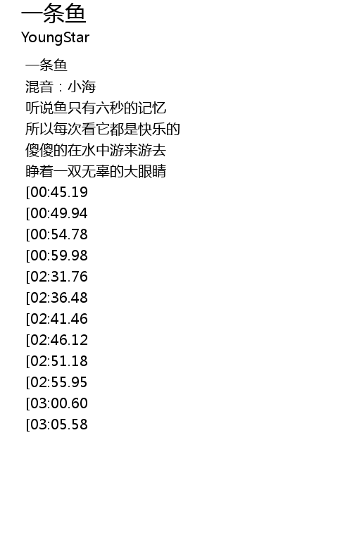 | [03:10.71] [02:31.76] [01:04.43] | wo yuan yi zuo yi tiao yu |